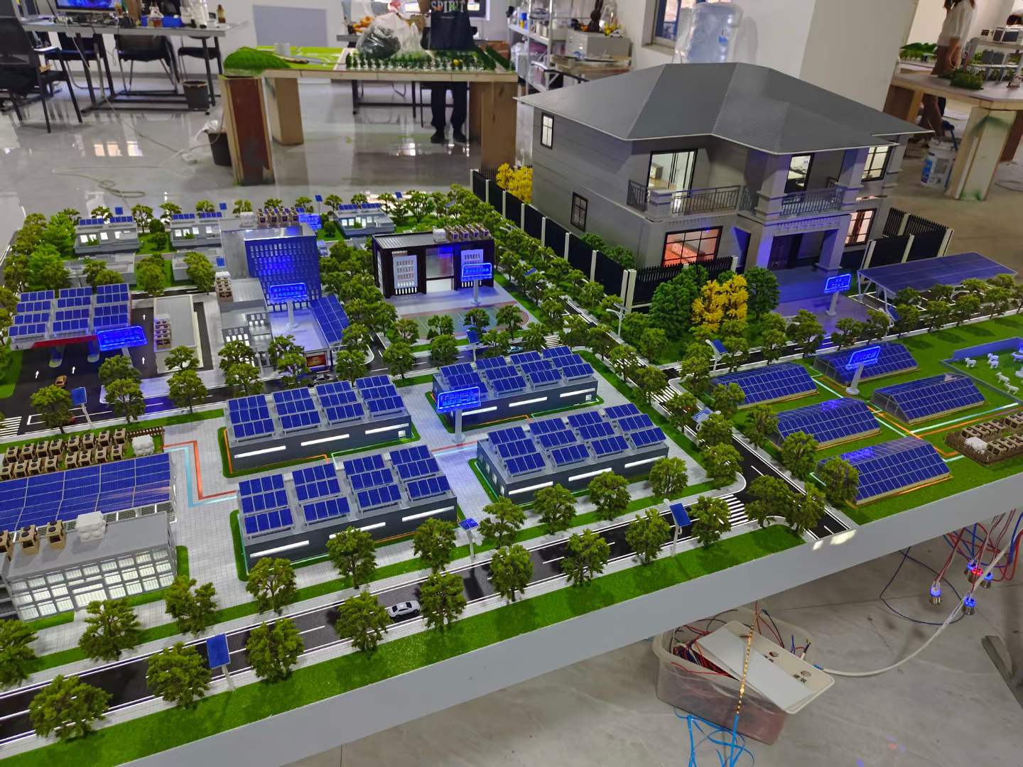 灯光系统是本模型的亮点。采用LED点光源与线性灯带组合,模拟厂区照明、光伏阵列轮廓灯、储能系统运行指示灯等。控制模块可编程,支持“白天/夜晚”模式切换,夜晚模式下,光伏板边缘泛出蓝色微光,储能站与配电房内部灯光亮起,道路路灯依次点亮,整体效果科技感十足,直观展示新能源系统的运行状态。