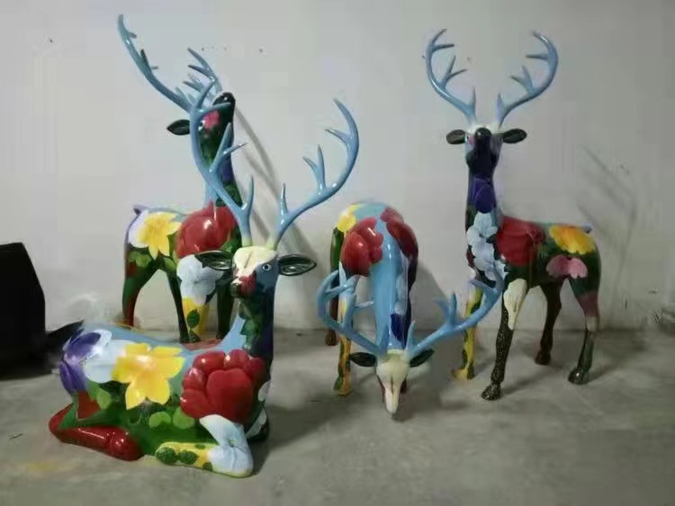 这是一组以“彩绘鹿”为主题的户外雕塑模型,其制作工艺融合了传统手作彩绘与现代雕塑技法,通过精细的材料选择、成型工艺与后期艺术处理,实现了对设计图稿90%以上的高还原度,无论是鹿角的曲线、身体的动态,还是花卉图案的色彩层次,都达到了可直接用于广场、园林、商业空间展示的成品级效果。